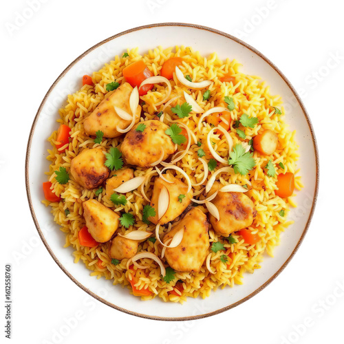 Delicious chicken and vegetable fried rice served in a white bowl isolated on transparent background