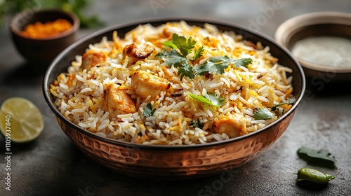 Delicious chicken biryani in a copper bowl, garnished with cilantro, served with lime and spices.