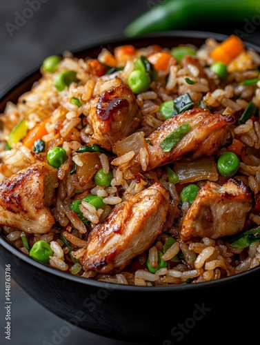 Delicious Chicken Fried Rice Bowl with Peas, Carrots and Scallions
