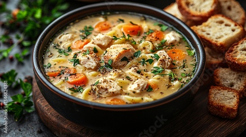 Delicious Chicken Noodle Soup with Fresh Vegetables and Crusty Bread on a Rustic Wooden Surface
