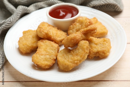 Delicious chicken nuggets and ketchup on wooden table, closeup