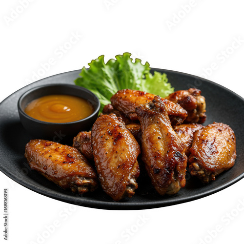 Delicious chicken wings with sauce on plate isolated on transparent background