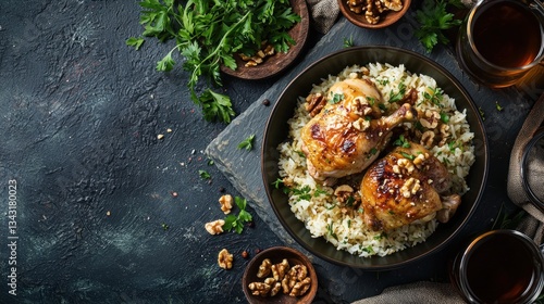 Delicious chicken with rice and walnuts served in bowl with drink and fresh herbs dark moody background