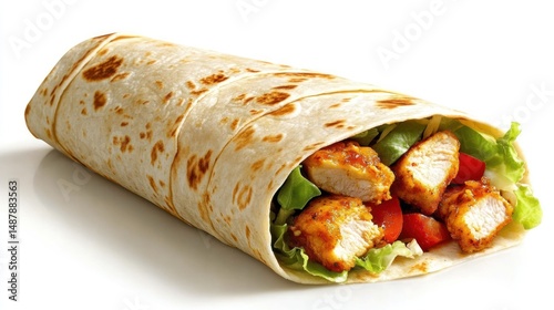 Delicious chicken wrap with fresh vegetables and toppings on a white background