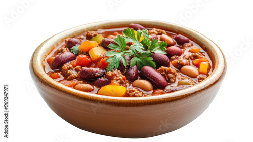 Delicious chili with beans, ground meat, and colorful vegetables garnished with fresh parsley, perfect for hearty meal.