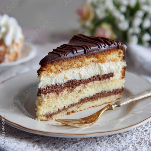 Delicious chocolate and cream layered cake slice on a vintage plate with floral decoration in the background