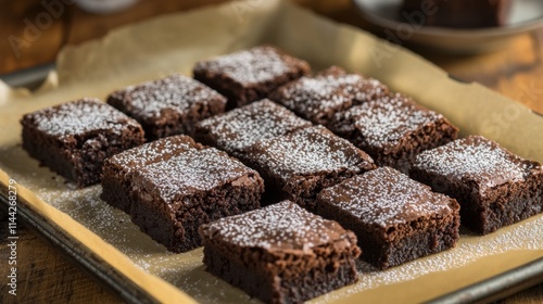 Delicious Chocolate Brownies with Powdered Sugar on Wooden Table