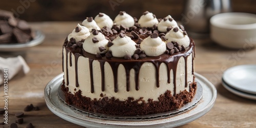 Delicious chocolate cake topped with rich chocolate chips and decadent icing, beautifully adorned with meringues. A perfect confectionery treat for birthdays or festive celebrations.