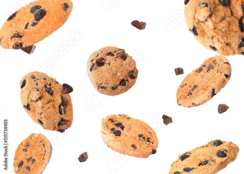 Delicious chocolate chip cookies falling on white background