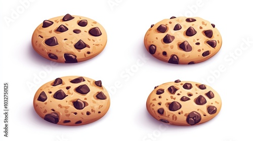 Delicious Chocolate Chip Cookies Game Assets - Set of Four Minimalist Low Poly Icons with Playful Imagery on White Background