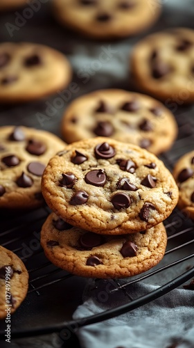 Delicious chocolate chip cookies stacked on a wire rack, warm and inviting.