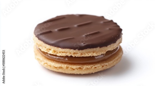 Delicious Chocolate Coated Sandwich Cookie with Caramel Filling on White Background Perfect for Food Photography and Culinary Projects