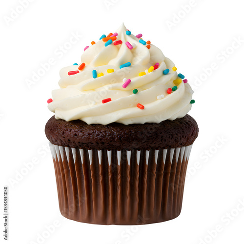 Delicious chocolate cupcake with creamy white frosting and colorful sprinkles on top, perfect for sweet treat or celebration, isolated on white or transparent background. PNG
