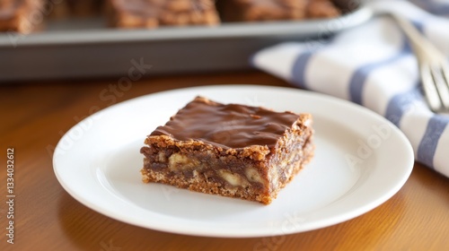 Delicious chocolate dessert bar with nuts and caramel served on a white plate, freshly baked and enticing