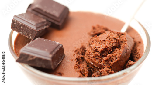 Delicious chocolate mousse and black chocolate pieces in a transparent bowl on a white background,