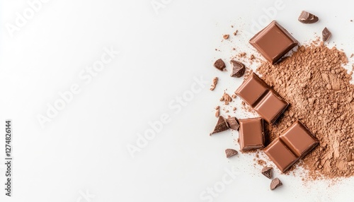 Delicious Chocolate Pieces and Cocoa Powder on White Background