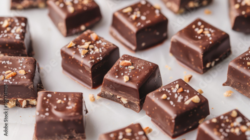 Delicious chocolate squares topped with crunchy nuts and sprinkled with salt, arranged neatly on a surface, showcasing a rich, indulgent treat.