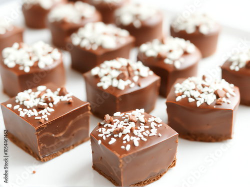Delicious chocolate squares topped with crunchy sprinkles on a white platter at a dessert gathering
