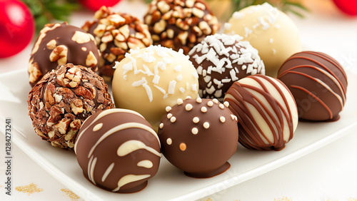 Delicious chocolate truffles decorated with pecan nuts, coconut and white chocolate drizzle resting on a white plate