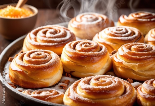 delicious cinnamon rolls freshly baked sweet glaze, pastry, dessert, treat, snack, breakfast, aroma, golden, swirl, icing, homemade, bakery, confectionery