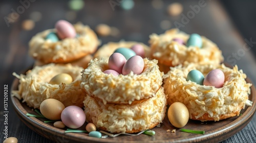 Delicious coconut nest cookies topped with colorful candy eggs for a festive celebration