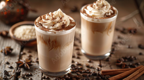 Delicious coffee drinks topped with whipped cream and cocoa, surrounded by coffee beans and spices, create warm atmosphere