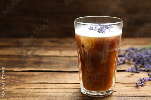 Delicious coffee with lavender on wooden table. Space for text