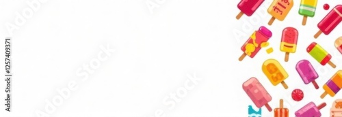 Delicious colorful popsicle ice cream, dessert, flat illustration on white background, banner with space for text
