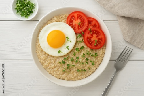 Delicious cooked oatmeal topped with a fried egg, fresh tomato slices, and microgreens on a white wooden surface, flat lay