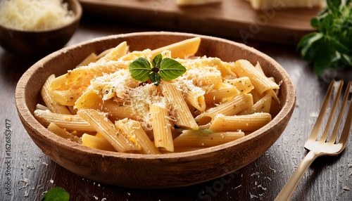 delicious cooked penne pasta with parmesan cheese in rustic wooden bowl