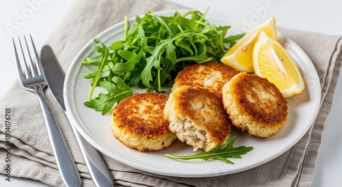 Delicious crab cakes with fresh arugula salad and lemon wedges on a white plate
