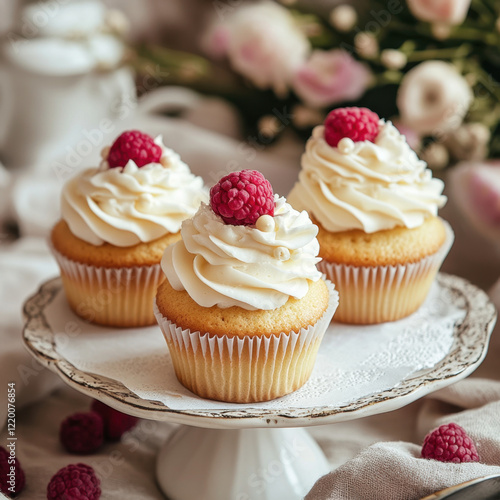 Delicious cream cupcakes topped with fresh raspberries and decorative pearls, perfect for any celebration or dessert table