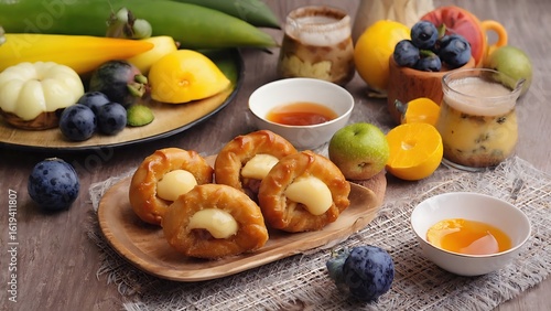Delicious cream filled donuts and fresh fruits in a vibrant and colorful food photography composition.