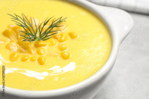 Delicious creamy corn soup in bowl on table, closeup