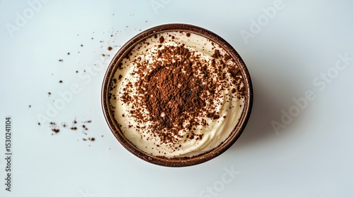 Delicious creamy dessert topped with cocoa powder in a dark bowl.