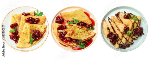 Delicious crepes served with cherry jam isolated on white, set. Top view