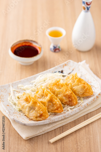 Delicious Crispy Dumplings Served with Soy Sauce and Vinegar