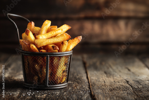 Delicious crispy French fries served hot in metal basket on rustic surface white