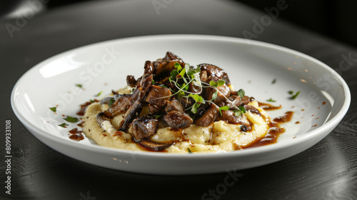 Delicious croatian-inspired risotto with wild mushrooms and fresh herbs, beautifully presented on a white plate against a dark backdrop
