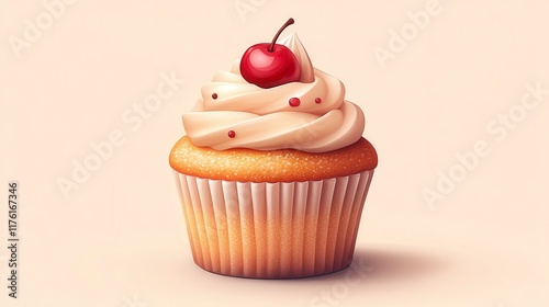Delicious cupcake with vanilla frosting and cherry.