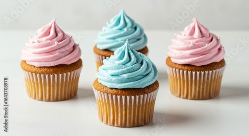 Delicious cupcakes with pastel frosting and edible pearl sprinkles, perfect for any party or celebration on a light surface.