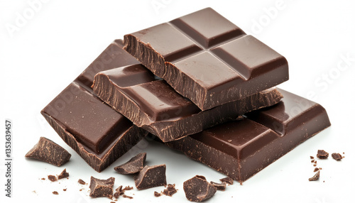 Delicious Dark Chocolate Bar Pieces Stacked Isolated on White Background