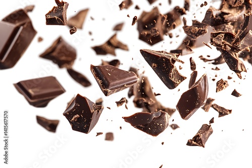 Delicious Dark Chocolate Chunks Exploding, Flying in Air on a White Background, Detail