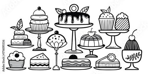 Delicious desserts assortment featuring cakes cupcakes and pastries collection line art