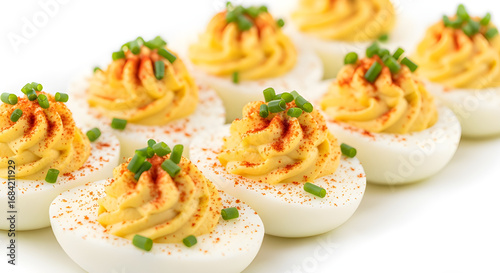 Delicious deviled eggs, a classic appetizer topped with paprika and chives