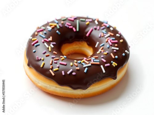 Delicious donut topped with chocolate glaze and colorful sprinkles ready to be eaten as dessert or snack item