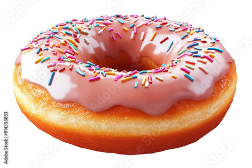 Delicious donut topped with pink icing and colorful sprinkles, perfect for desserts or bakery-themed designs.