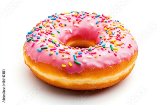 Delicious donut with pink frosting and colorful sprinkles for dessert, snack, or breakfast use cases