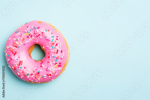 Delicious donut with pink glaze and sprinkles on light blue background with copy space.