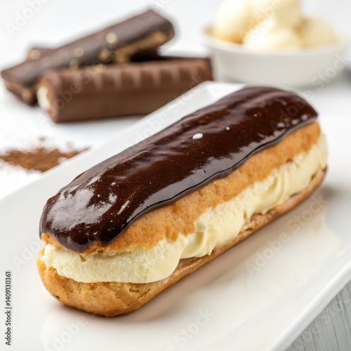 Delicious eclair with chocolate topping and cream filling on a plate.
